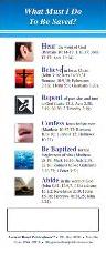 The "What Must I Do to Be Saved?" Bookmark is a tool designed to be used in Bible Study with non-Christians. Each card features the question of the Philippian Jailor, “What must I do to be saved?” (Acts 16:30), followed by each step in the plan of salvation followed by Scripture references. At the bottom is a space to put a name, number, or address for follow-up study. It is available in multiple languages. |